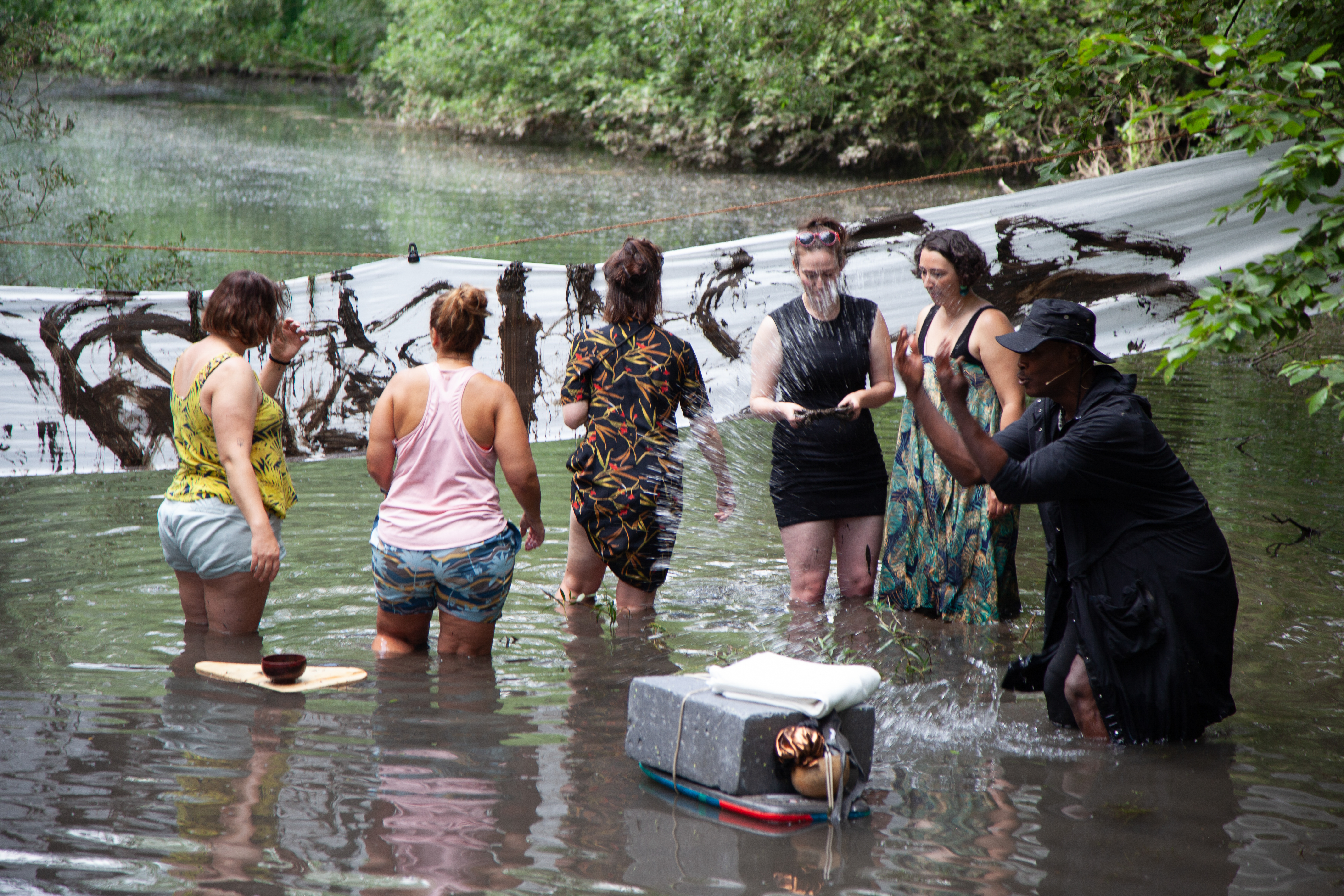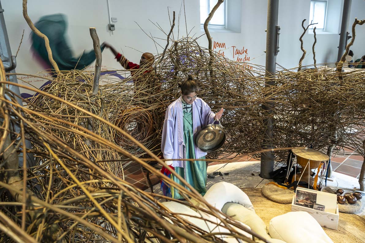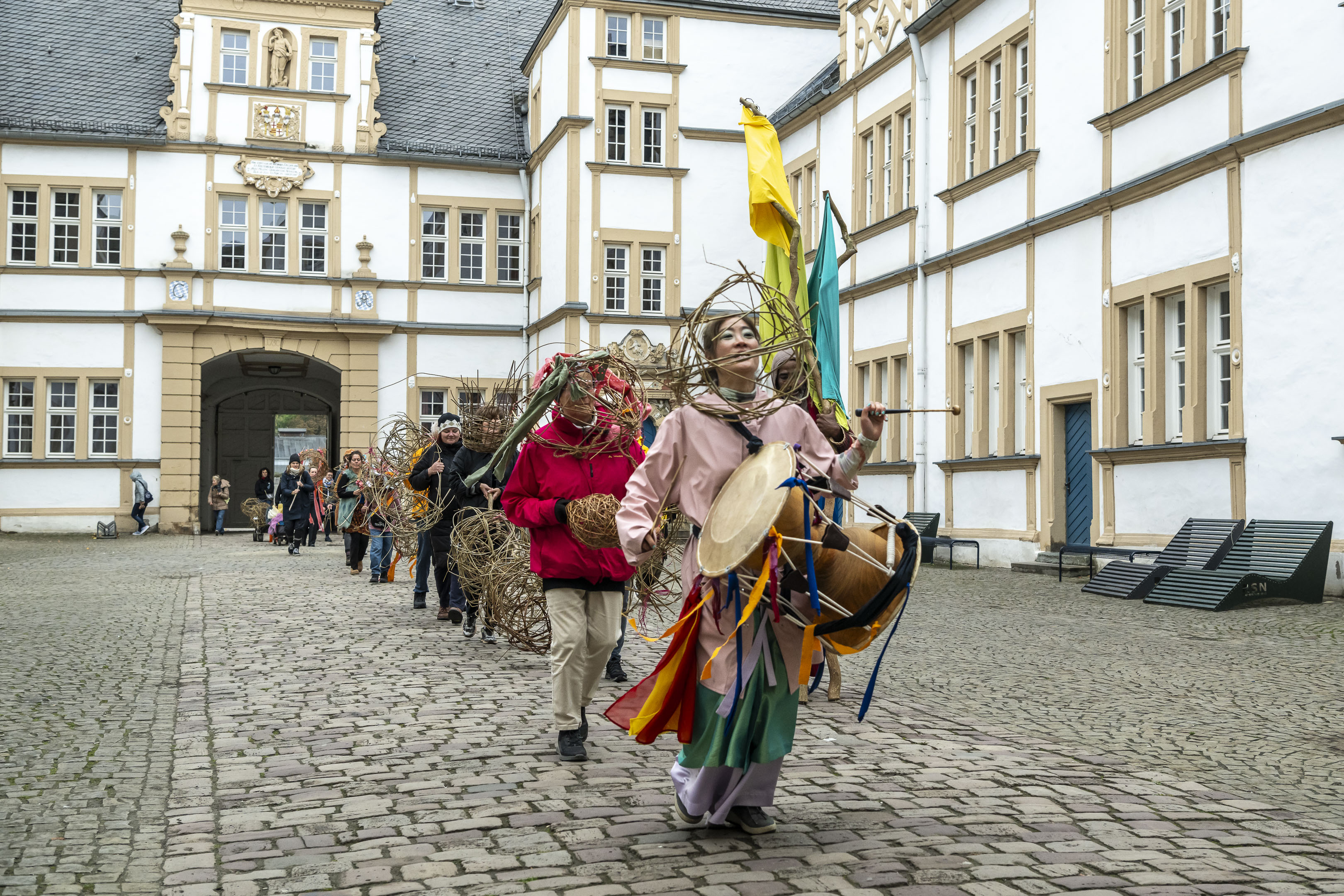 Die Künstlerin Daniela Brasil rahmte die Ausstellung mit zwei Performances, die das Publikum zum Mitmachen animierten: Am Eröffnungswochenende lud das Daily Rhythms Collective – bestehend aus Daniela Brasil, Hyo Jin Shin und Otto Oscar Hernández Ruiz – gemeinsam mit der Klangkünstlerin Hye-Eun Kim zu einem Schlammbad ein, um sich körperlich und spirituell mit der Pader und ihren mehr-als-menschlichen Bewohner:innen zu verbinden. Ausgehend von einem Gedicht von Maya Angelou entstand eine temporäre gemeinschaftliche Zeremonie aus Feldaufnahmen, Stimmen, Percussion, elektronischer Musik und Bewegung, die das Publikum einlud, eine Beziehung zum Schlamm und zur Pader einzugehen. Das Ende der Ausstellung markiert eine weitere Performance: In einer gemeinschaftlichen Aktion wurden die Weiden und die während der Ausstellungszeit gesammelten Naturmaterialien von Daniela Brasils Kunstwerk Wenn die Pader regnet, bade in den Wolken der Pader zurückgegeben.