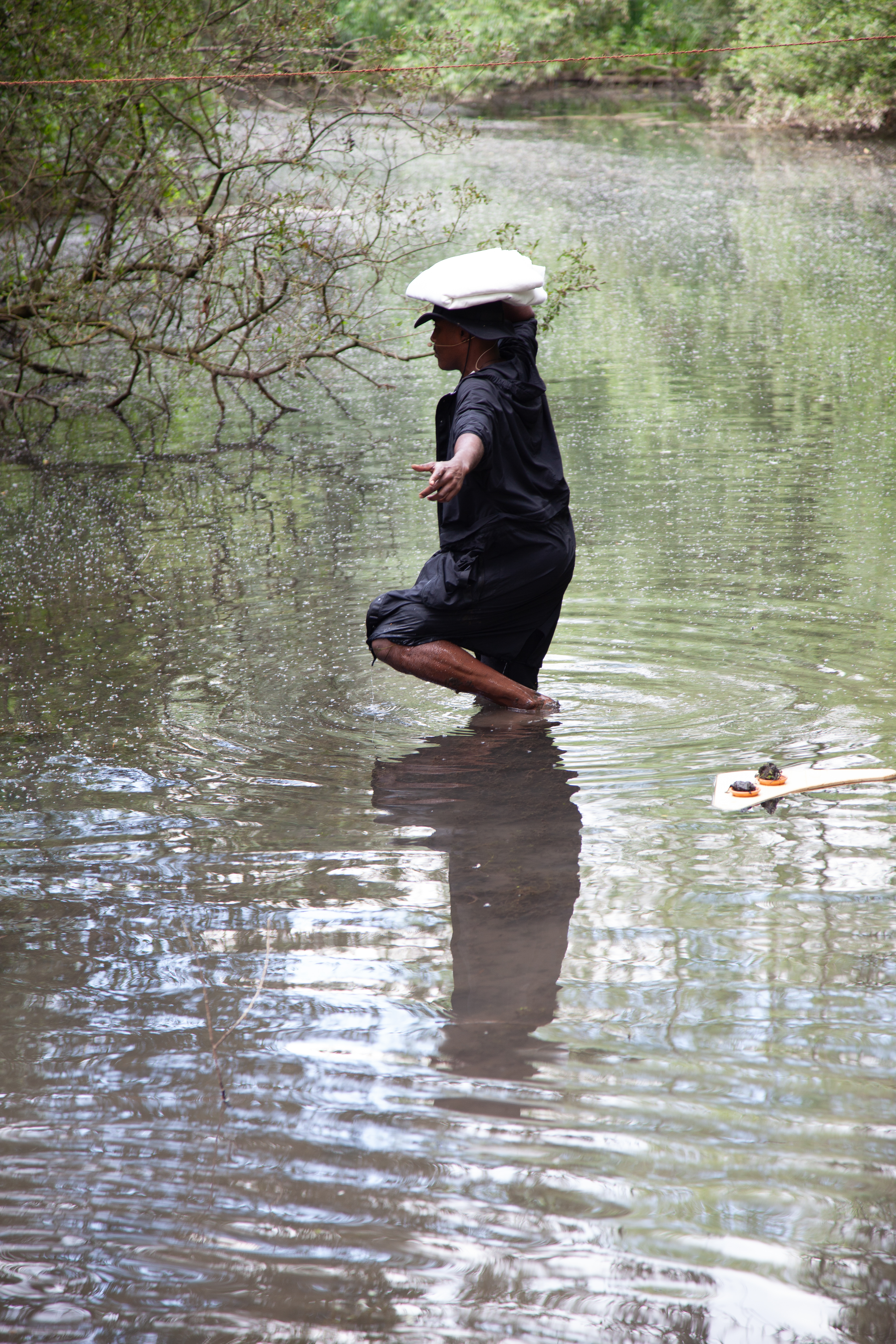 Daniela Brasil schafft in ihren Kunstwerken Räume des gemeinsamen Wissensaustauschs, der in der Begegnung verschiedener Körper und ihren Interaktionen erfolgt – emotional und kreativ. Das Wissen kommt dabei vom Fluss und seinem Ökosystem.