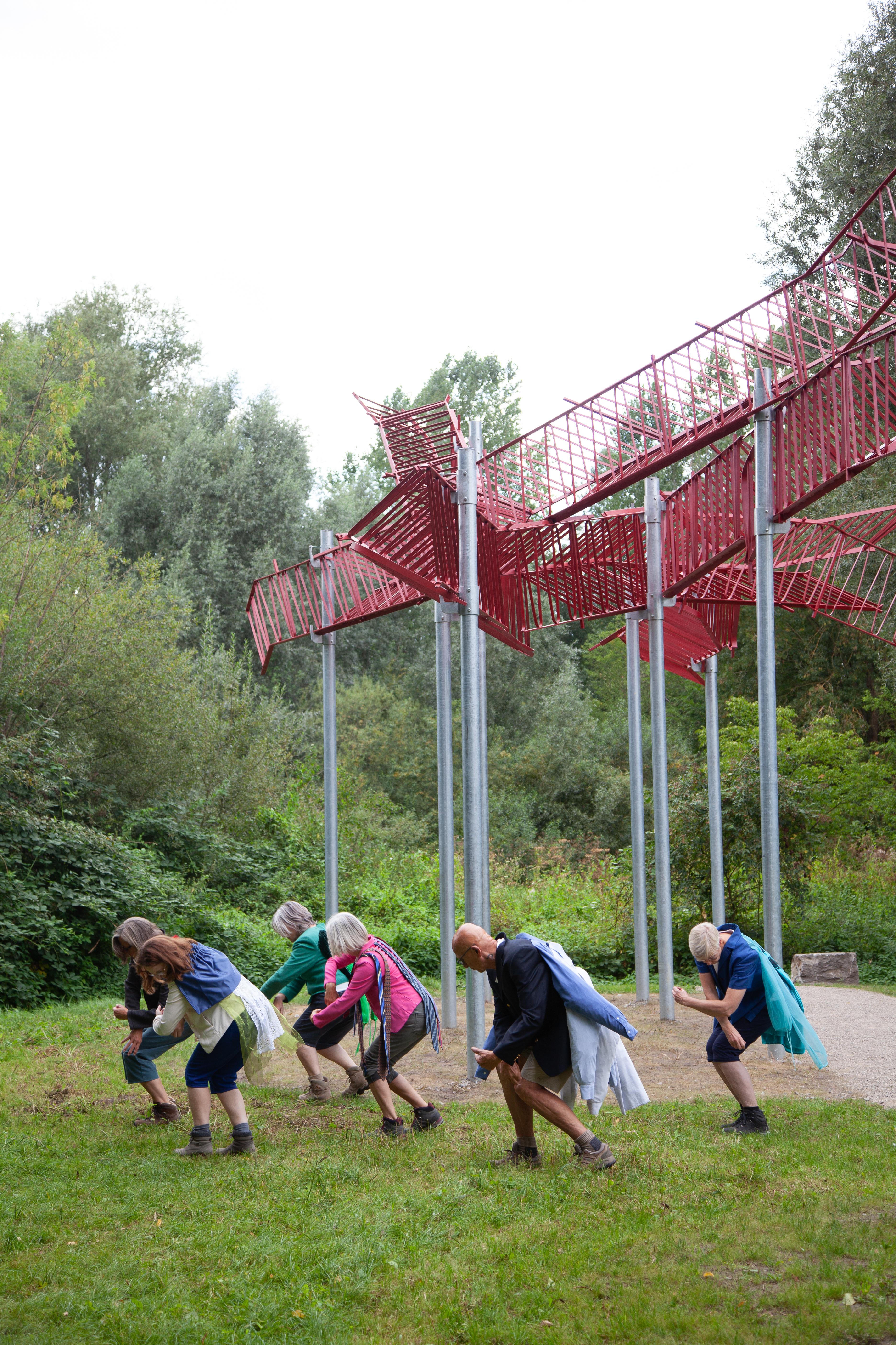 • Die Performer und Performerinnen der Performance Gruppe Flusswärts tanzen vor dem Kunstwerk von raumlaborberlin.