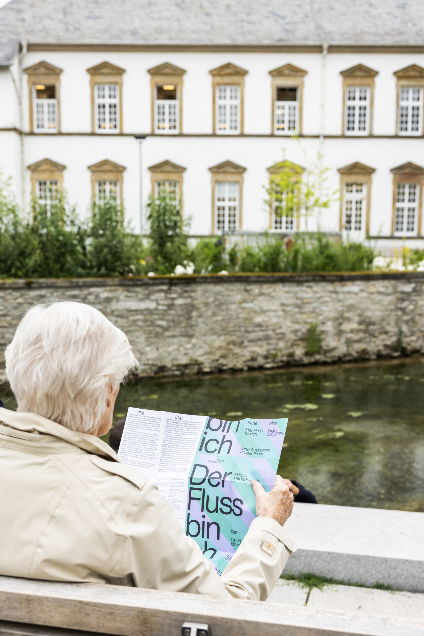 • Eine ältere Person blickt in ein Programmheft zur Ausstellung, im Hintergrund die Pader und die Stadtbibliothek.
