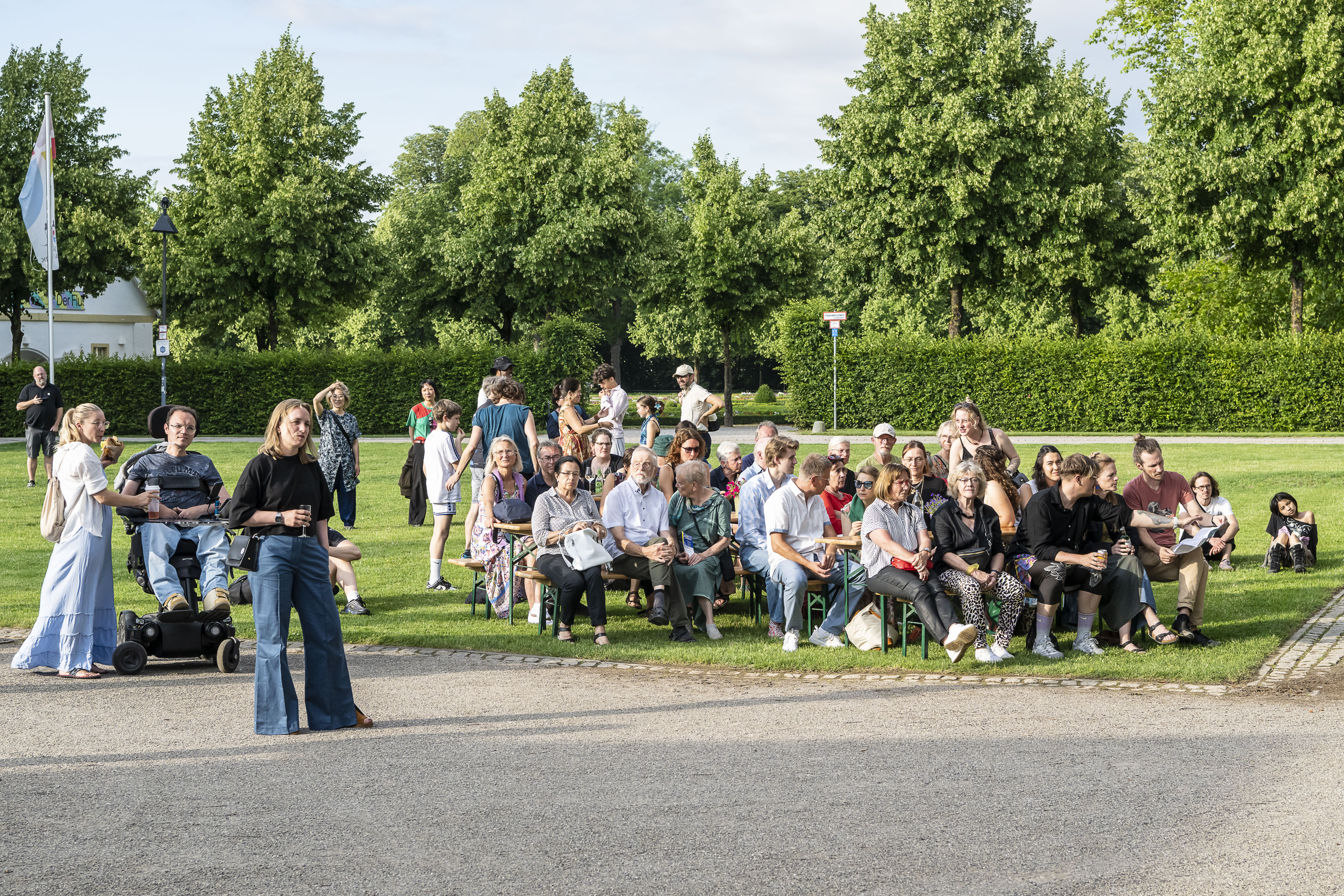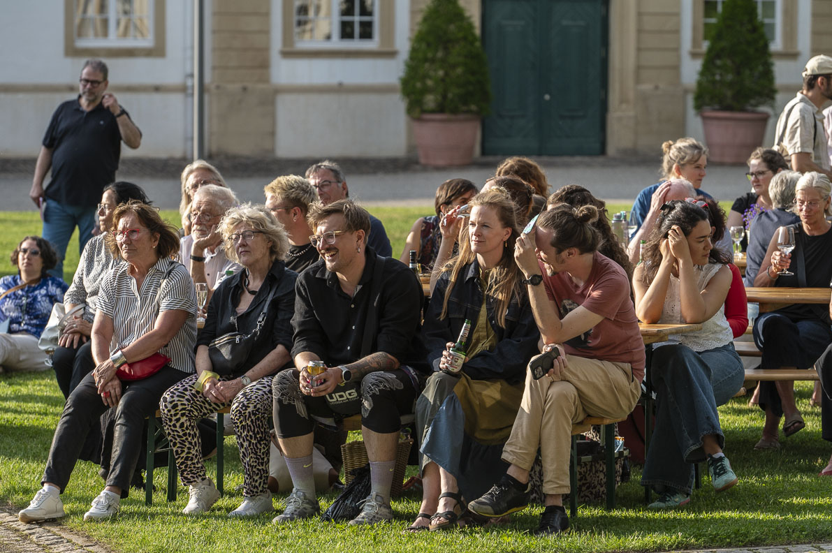 Manfred Webel eröffnete das Programm mit einem Einblick in seine künstlerische Praxis. Die lokale Mode- und Textildesignerin sowie Kunstvermittlerin Laura Schlütz beleuchtete unter dem Fokus auf Materialität die textilen Arbeiten von Sophie Utikal. Francesco Apuzzo von raumlaborberlin und Zhenru Liang vermittelten an zwei der vier Standorte ihrer Intervention direkte Einblicke in ihre Arbeit. Live-Sets der Musikerin Anushka Chkheidze sowie des Künstler:innenduos Lex Rütten und Jana Kerima Stolzer bereicherten den Eröffnungsabend am Schloss Neuhaus.