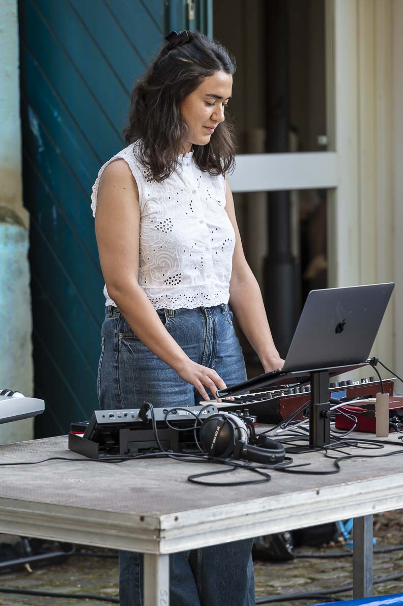 • Die Künstlerin Anushka Chkeidze am Mischpult vor dem Museum Schloss Neuhaus.