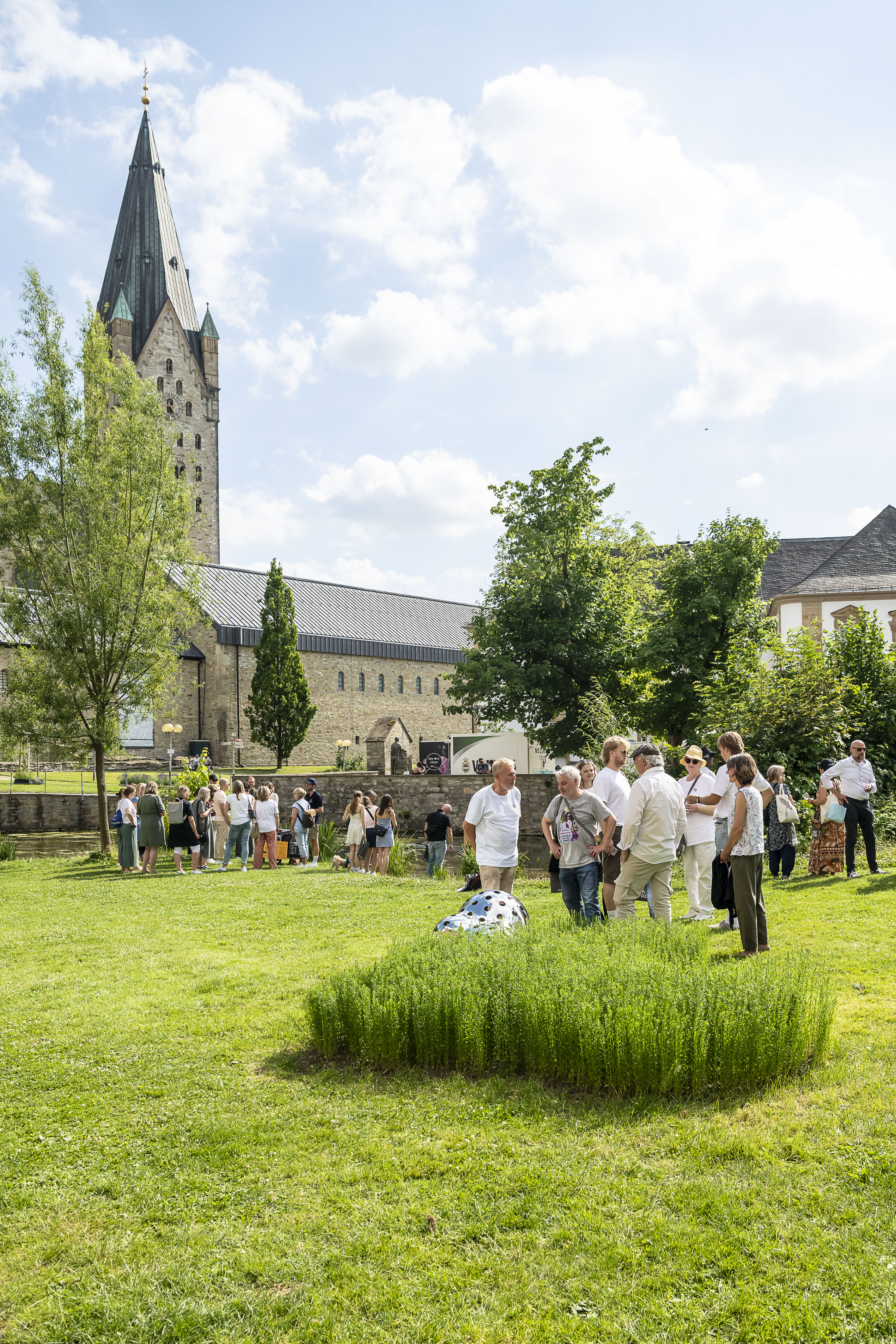 • Mehrere Gruppen von Menschen stehen und unterhalten sich auf einer großen Wiese, im Hintergrund ragt der Turm des Paderborner Doms auf. In der Mitte ist ein rundes Stück höher wachsendes Flachs zu sehen, das wie eine kleine Installation wirkt.