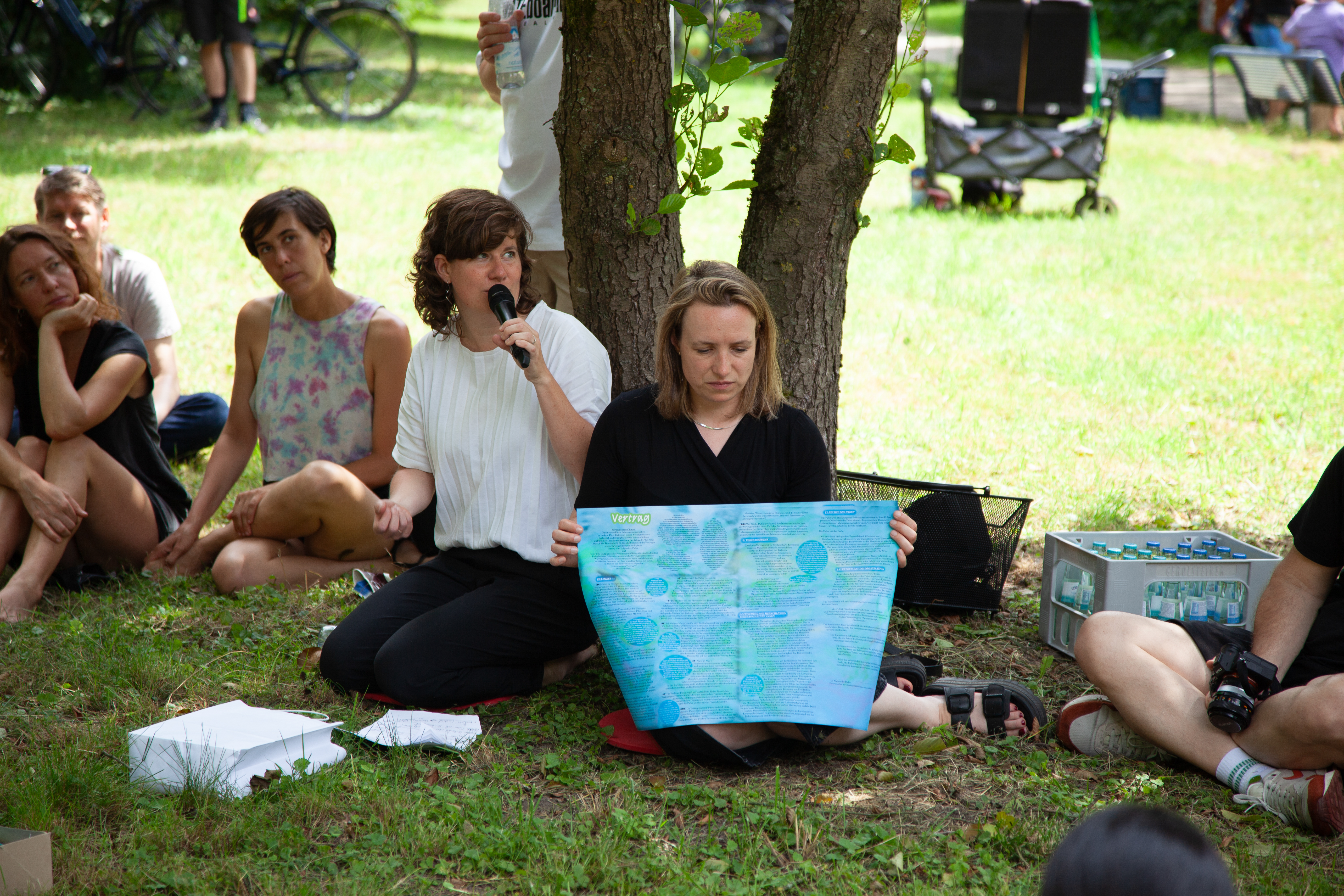 • Das Bild zeigt eine Gruppe von Menschen, die im Grünen auf dem Rasen sitzen; eine Person hält ein Mikrofon, während eine andere ein großes, blaues Plakat präsentiert.