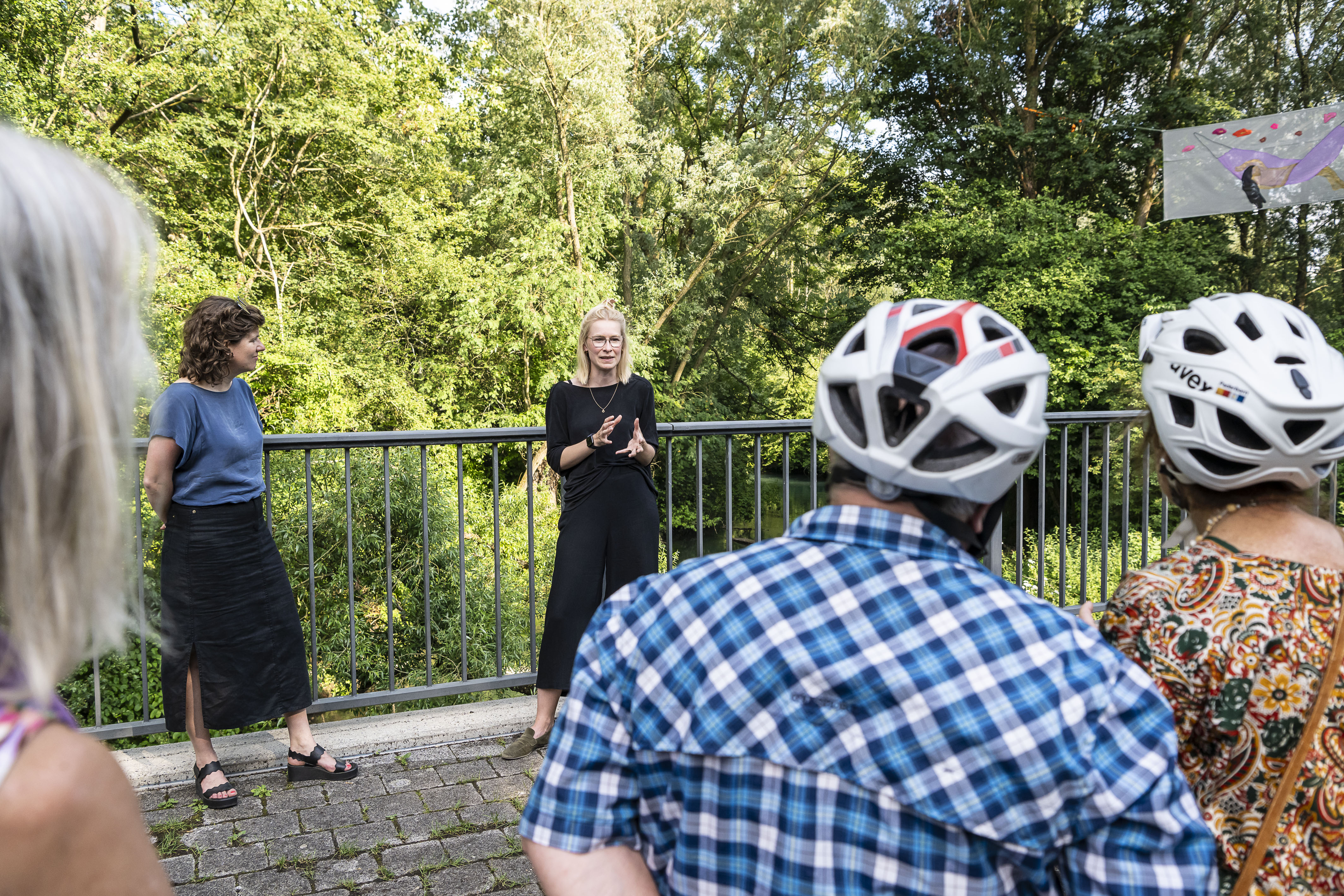 • Eine Gruppe von Menschen mit Fahrradhelmen steht auf einer Brücke, während zwei Frauen vorne sprechen; hinter ihnen ist dichtes grünes Laubwerk, und darin ein Banner, zu sehen. Die Sprecherin gestikuliert ruhig, während die Zuhörenden aufmerksam zuhören.
