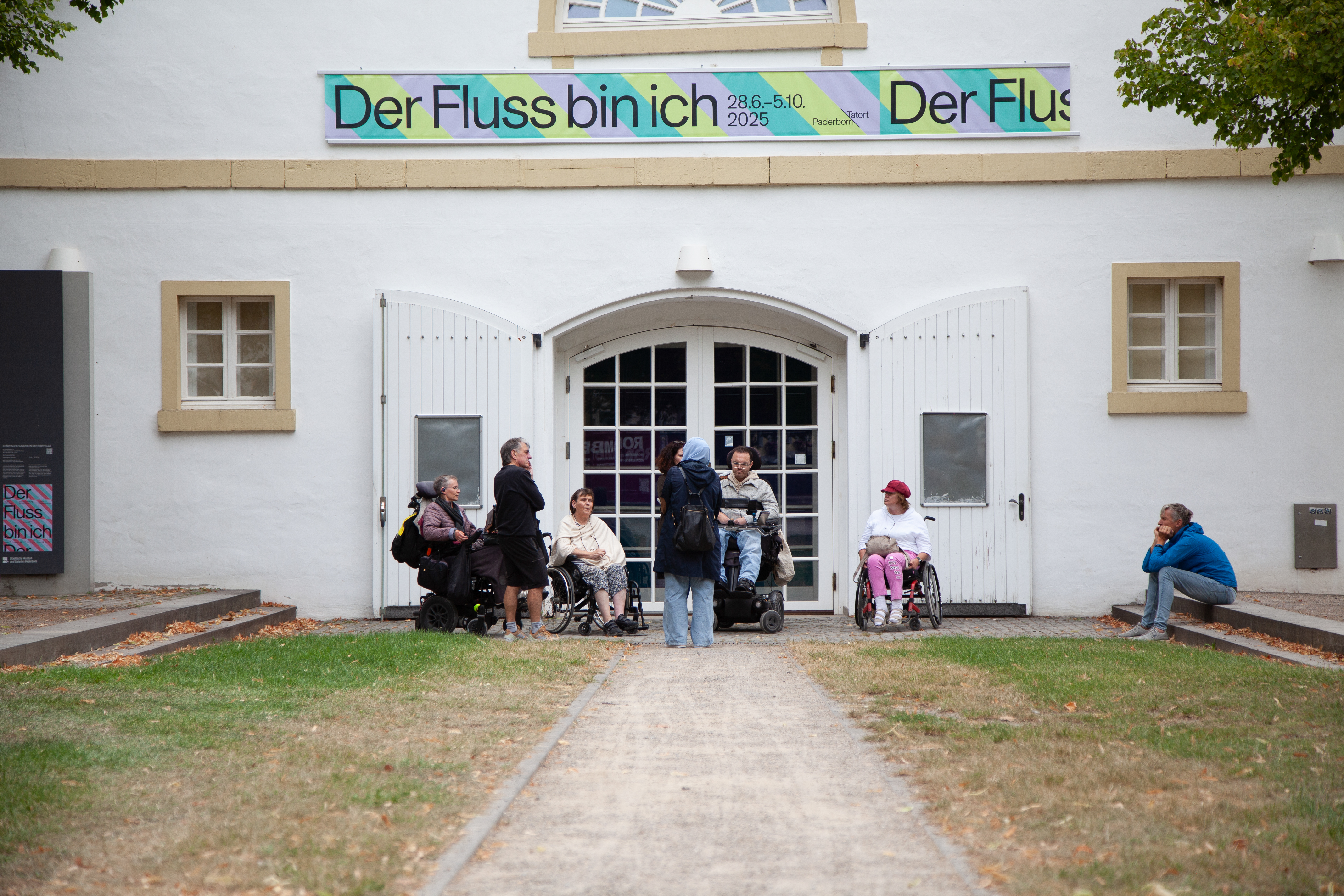 Ein eigens konzipierter Fokustag Inklusion ermöglichte einen barrierearmen, vielfältigen und offenen Zugang zur Ausstellung Der Fluss bin ich – für alle Besucher:innen, unabhängig von körperlichen oder sensorischen Voraussetzungen. Die geführten Touren wurden gezielt auf unterschiedliche Bedürfnisse abgestimmt: Menschen mit Seh- oder Höreinschränkungen, mit Mobilitätsbeeinträchtigungen oder Rollstuhlnutzung ebenso wie Menschen ohne Beeinträchtigung erhielten jeweils passgenaue, individuell entwickelte Zugänge zu den Kunstwerken.